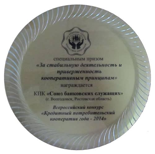 Кооператив получил награду "За стабильную деятельность и приверженность кооперативным принципам" во всероссийском конкурсе "Кредитный потребительский кооператив года - 2014".